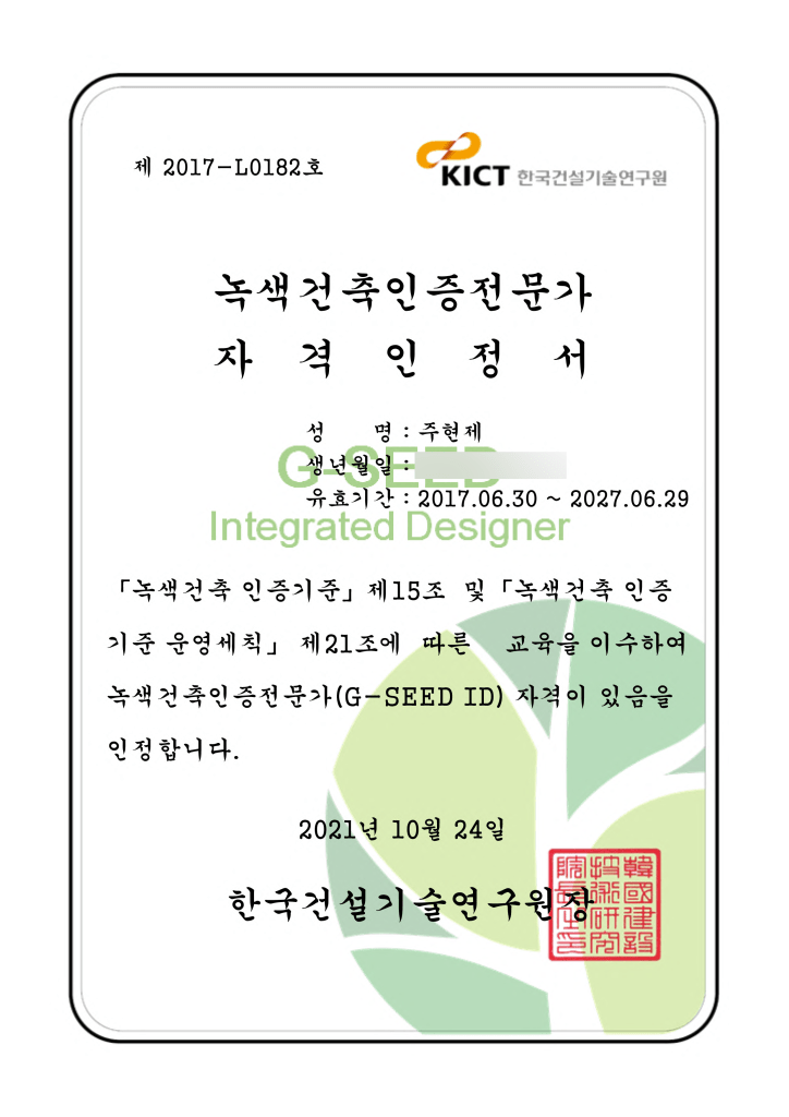 G-SEED ID 녹색건축 인증전문가 Hyunje Joo 주현제30/05/202112/01/2022news Beitrags-Navigation VorherigerWeiter G-SEED ID 녹색건축 전문가 자격을 취득하여 녹색건축 전문가로서 활동하게 되었습니다. Teilen mit: Klicke, um auf X zu teilen (Wird in neuem Fenster geöffnet) X Klick, um auf Facebook zu teilen (Wird in neuem Fenster geöffnet) Facebook Klick, um auf Pinterest zu teilen (Wird in neuem Fenster geöffnet) Pinterest