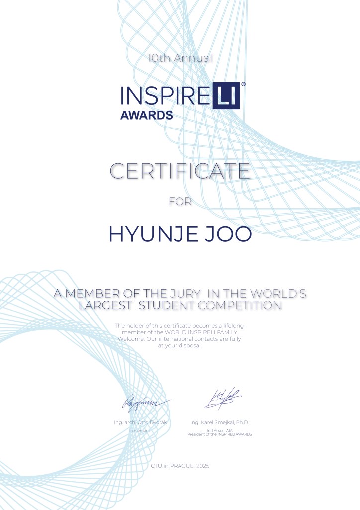 JURY FOR INSPIRE LI AWARDS Hyunje Joo 주현제09/03/202509/03/2025news Beitrags-Navigation VorherigerWeiter 10th Annual 체코에서 개최되는 INSPIRE LI AWARD 국제건축 학생공모전 심사위원으로 위촉되었습니다. Teilen mit: Klicke, um auf X zu teilen (Wird in neuem Fenster geöffnet) X Klick, um auf Facebook zu teilen (Wird in neuem Fenster geöffnet) Facebook Klick, um auf Pinterest zu teilen (Wird in neuem Fenster geöffnet) Pinterest