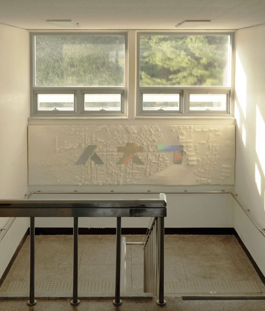 계단실 벽면에 삼척시가지 모형에 학과 로고 ‚ㅅㅊㄱ‘ 를 반영하여 맞이하는 공간이 되기를 바라며 학생들과 함께 작업하였습니다.